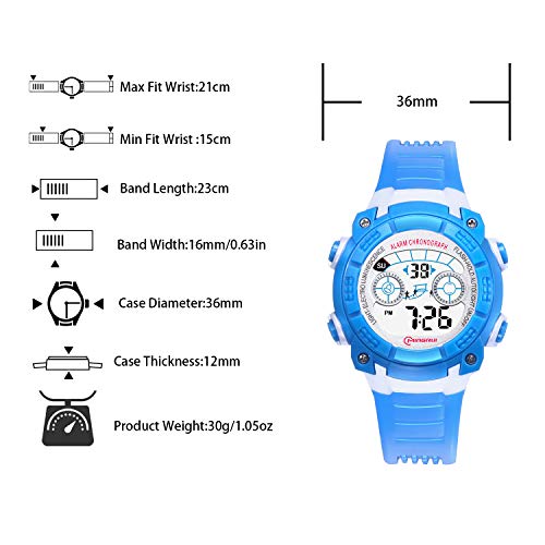 [Orologio Bambini Sportivo Impermeabile 30M]: L'orologio impermeabile è resistente all'acqua per 30 M, senza problemi per l'uso quotidiano, come ad esempio: giorno di pioggia, lavaggio a mano. È un regalo meraviglioso per i bambini dai 4 ai 15 anni. Attenzione: non premere alcun pulsante nell'acqua. Rimuovere la pellicola protettiva di plastica dalla superficie dello schermo prima di usarla.