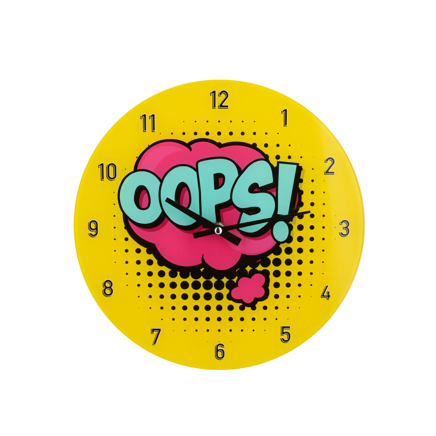 Personalizza gli ambienti di casa aggiungendo elementi in linea con la tua personalità allegra e unica, come questo coloratissimo orologio! Il design giallo con fumetto e scritta Oops! è un omaggio alla Pop Art e arrederà con uno stile giovane e fresco il tuo appartamento, dalla cameretta al soggiorno, o anche l'ufficio. Avrai sempre ben in evidenza l'ora così non rischierai di arrivare in ritardo ai tuoi appuntamenti. Una bella idea regalo per gli amici e i colleghi, soprattutto quelli poco puntuali! L'orologio si appende facilmente alla parete tramite supporto posto sul retro e funziona con pile AA non incluse. Diametro quadrante tondo: 30 cm.