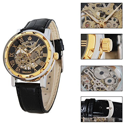 GuTe, orologio da polso analogico, da uomo, analogico, in stile Steampunk, con numeri romani, cinturino in pelle nera, quadrante luminoso, cassa dorata