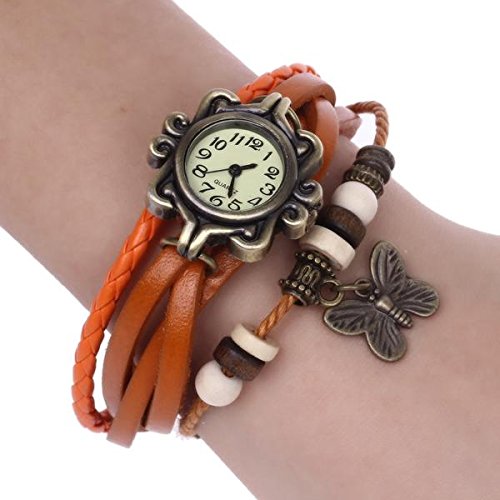 Orologio Polso Quarzo Bracciale Donna Farfalla Cinturino Arancio Cuoio Classico