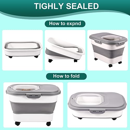 OROMYO Contenitore per cibo per animali domestici, 10 kg, ermetico con ruote, pala e misurino trasparente, pieghevole, con coperchio, scatola per cani (grigio)