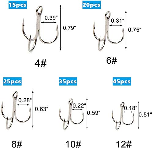 Ami da pesca assortiti in 5 misure: 4 #: 15 pezzi, 6 #: 20 pezzi, 8 #: 25 pezzi, 10 #: 35 pezzi, 12 #: 45 pezzi.