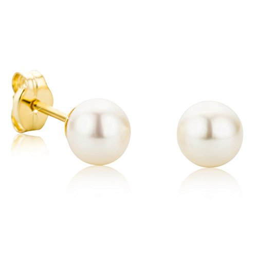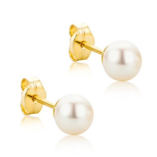 Orovi Orecchini Perle in Oro Giallo, Vero Oro 9KT 375, Orecchini Donna Piccoli a lobo con Perle Vere coltivate d'acqua dolce 5,00 MM, Bottone anallergico perno oro e chiusura farfalla a pressione.