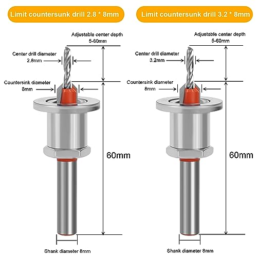 Orssmigs 2 Pezzi Svasatore per Legno 8mm Punte con Svasatore per Legno Trapano a Svasatura Regolabile Punta Svasatore Conica Smusso Svasatore Punta da Trapano per Falegnameria, Legno (2.8+3.2mm)