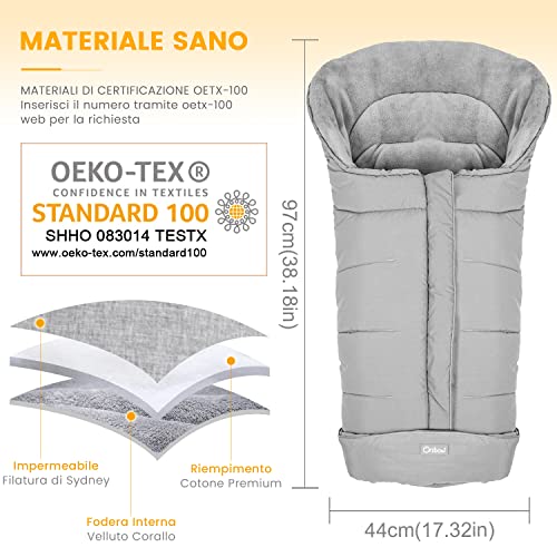 Orzbow Sacco Termico Passeggino Universale Invernale,Caldo Velluto Corallo,Cappuccio con Coulisse,Particelle Antiscivolo,Striscia Riflettente,Impermeabile e Lavabile in Lavatrice (Grigio Chiaro)