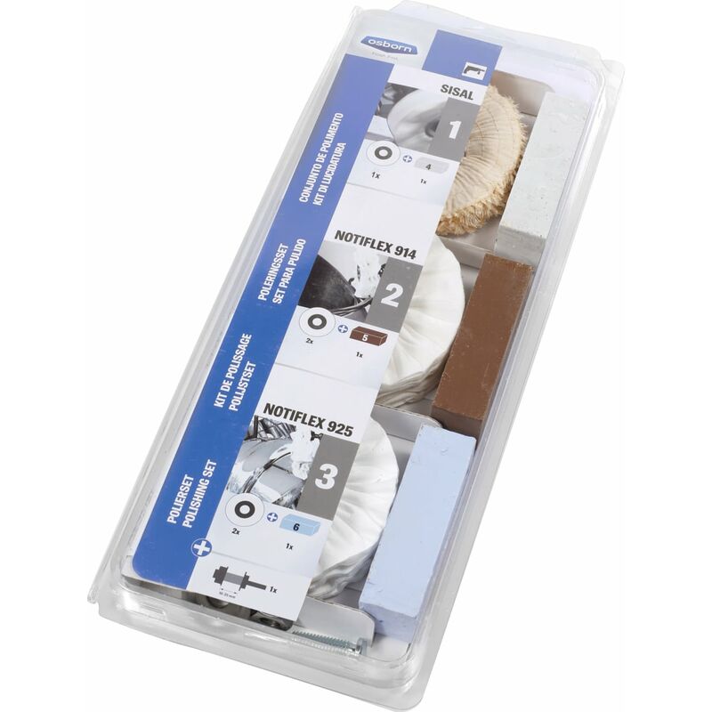 Set per lucidatura ⌀ 100 mm con un disco in Sisal e 2 dischi in tessuto per lucidatura per i tre tipi di lucidatura preliminare, livellamento e a specchio (lucidatura). Tre paste per lucidatura (Dim. BROWN, WHITE e BLUE) e un mandrino portapezzi di ⌀ 6 mm (per trapano o albero flessibile). Con istruzioni per la lucidatura. Uso: Adatto per tutti i metalli (inox, acciaio, alluminio, ottone). Dati tecnici Tipo di prodotto Disco in tessuto ⌀ Foro, mm 10 ⌀ Anello, mm 100