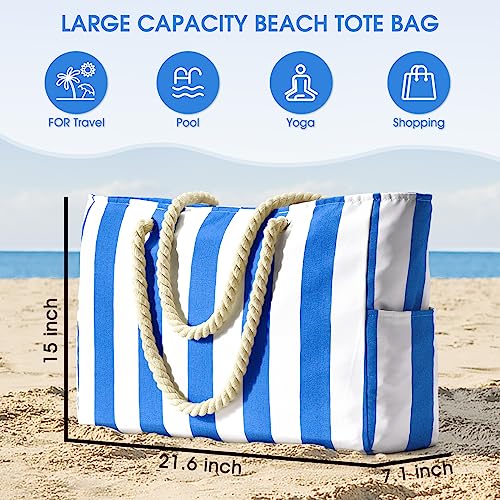 Oscaurt Beach Bags for Women, Pool Bag Waterproof Sandproof Beach Bag Large Capacity Beach Swim Bag with Zipper Stripe Beach Bag Tote, Blu