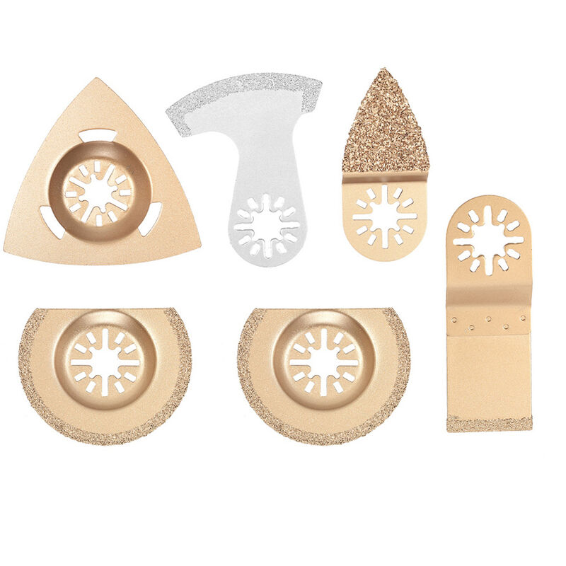 Questo kit lama di taglio professionale e compatibile è stato progettato per multifunzione utensili elettrici con 6pcs oscillante Multitool accessori. fogli macinazione lega vengono utilizzati per calcestruzzo taglio, plastica, legno, stucco, ottone, bronzo e lamiera. Smeriglio foglio macinazione è usato per tagliare oggetti duri come il cemento, piastrelle di ceramica, pietra e così via. Caratteristiche: Alta qualità e nuovi strumenti più lame con il più nuovo (foro di fiori per tutti gli usi) sega a sposare foro interno. Grande per il taglio di oggetti duri come il cemento, cemento, mattonelle di ceramica, pietra e così via. Fornire una grande durata, lunga durata e velocità di taglio veloce. Grande accessorio anche per materie plastiche taglio, legno, stucco, ottone, bronzo e lamiera. Elevata durezza, ottima resistenza all'usura ed eccellente resistenza agli urti. specifiche tecniche: Colore: Oro Materiale: Lega, Emery Adatti taglio Oggetti: calcestruzzo, cemento, piastrelle di