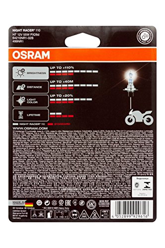 OSRAM NIGHT RACER 110 - Lampada alogena per moto con il 110% di luce in più sulla strada (rispetto a una lampada alogena standard). Design accattivante con rivestimento parziale azzurro e calotta argentata.