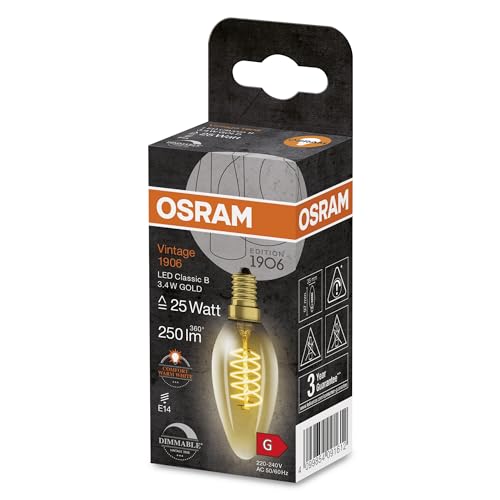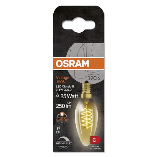 OSRAM Lampada a LED Vintage 1906 tinta dorata, 3.4W, 250 libbre, lampada classica di candele, classica B calzino E14, bianca calda, filamento a spirale, dimmerabile, fino a 15.000 ore;