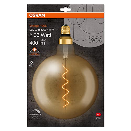 OSRAM Lampada LED Vintage 1906 vetro dorato, 4,8W, 400lm, forma Globo con diametro 200mm e attacco E27, luce bianca calda, filamento a spirale, dimmerabile, durata fino a 15.000 ore