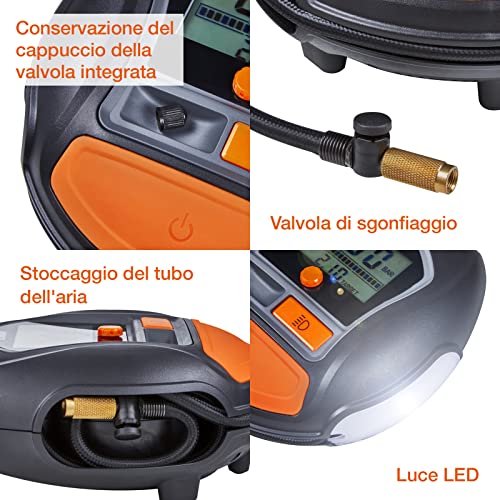 "Tempo di gonfiaggio rapido | Gonfia il pneumatico alla pressione desiderata in circa 2 minuti. Meccanismo di avvolgimento/svolgimento di un cordone strettamente avvolto. Luce LED | Facile da usare anche al buio e in condizioni di scarsa illuminazione"