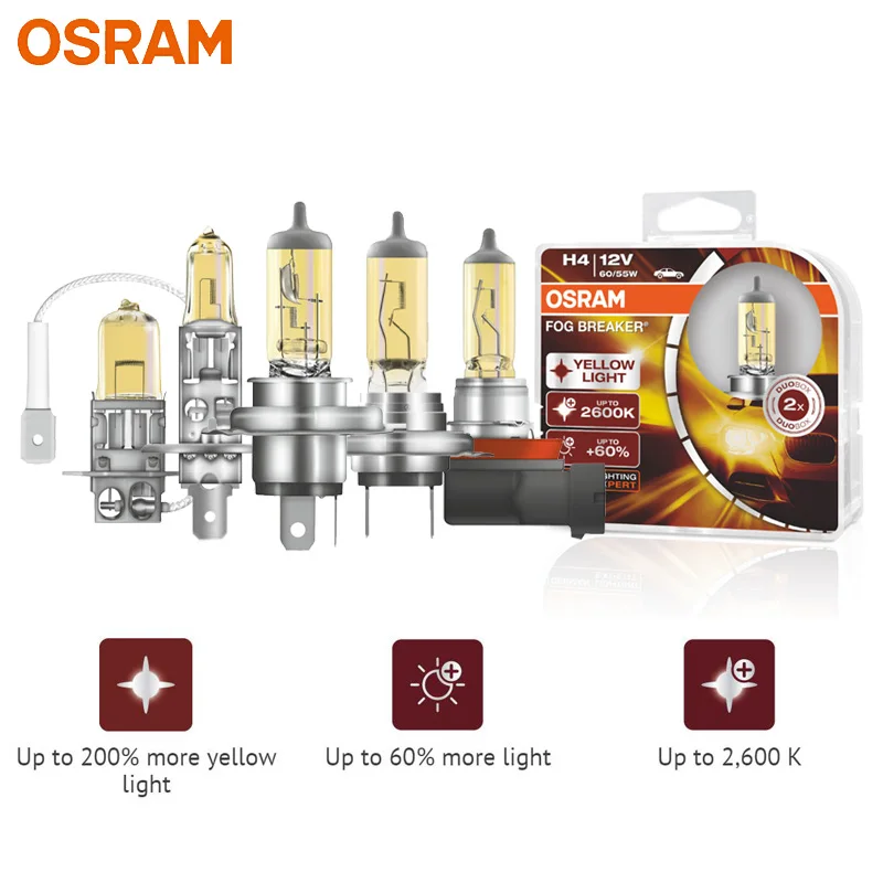 OSRAM H1 H3 H4 H7 H8 H11 H16 9005 9006 HB3 HB4 Yellow FBR Halogen Fog Breaker 12V Car Headlight 2600K Light +60% Brighter, Pair
