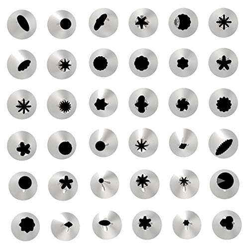 Set di decorazioni per torta: 42 beccucci per pasticceria, 1 tasca a bussola usa e getta, 4 tasche a bussola, 4 adattatori, 1 x chiodo di fiori, 3 x raschietto per torta, 1 x spazzola per la pulizia, 10 x tasca a bussola di tie, 1 x fiori forbici. Una varietà di accessori per torte può cucinare perfettamente torte.