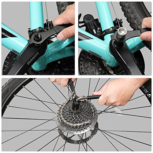 Strumento di Rimozione Multiuso 3 in 1: è possibile utilizzare una chiave a 12 denti per rimuovere il movimento centrale, la parte del gancio di coda rimuove l'anello di bloccaggio del movimento centrale della bicicletta e l'anello di bloccaggio del volano. Si applica anche a 7, 8, 9 e 10 cassette di velocità. La frusta a catena può anche svolgere il ruolo di fissare il volano e impedire la rotazione quando il volano è smontato.