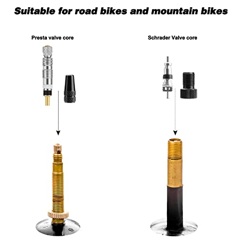 Nucleo della valvola: questo set contiene nuclei delle valvole Presta e nuclei delle valvole Schrader. Questi due nuclei delle valvole soddisfano le esigenze della maggior parte delle biciclette, realizzati in rame e lega di alluminio, robusti e stabili. E dotati dei corrispondenti cappucci protettivi.