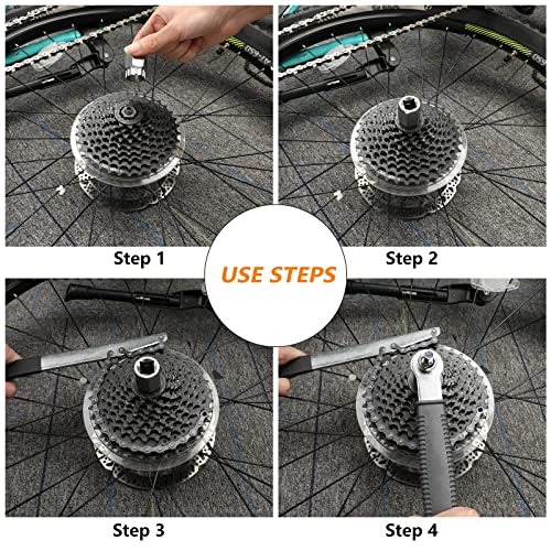 Chiave per catena per bici: la chiave a catena in argento per biciclette è forgiata in acciaio di alta qualità, robusta e resistente, manico rivestito antiscivolo, comodo e facile da usare, si adatta alla maggior parte delle marche di volano a cassetta a 7, 8, 9, 10, 11, 12 velocità, aiuta a installare e rimuovere il volano.