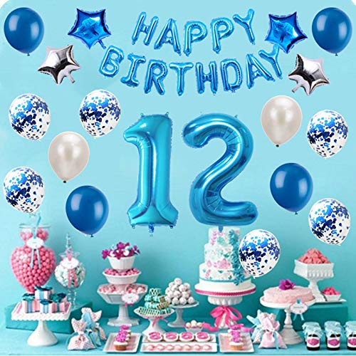 Oumezon 12 Compleanno Decorazione Blu, 12° Compleanno Decor per Ragazza Ragazzo Buon Compleanno Ghirlanda Banner Palloncino Foil Coriandoli Palloncini Deco Compleanno Numero Palloncini