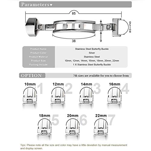 Come misurare le dimensioni: misurare la larghezza da un lato all'altro dove la fibbia si attacca al cinturino. Tenere presente che molti cinturini hanno un cono e sono più stretti all'estremità della fibbia rispetto all'estremità attaccata all'orologio.