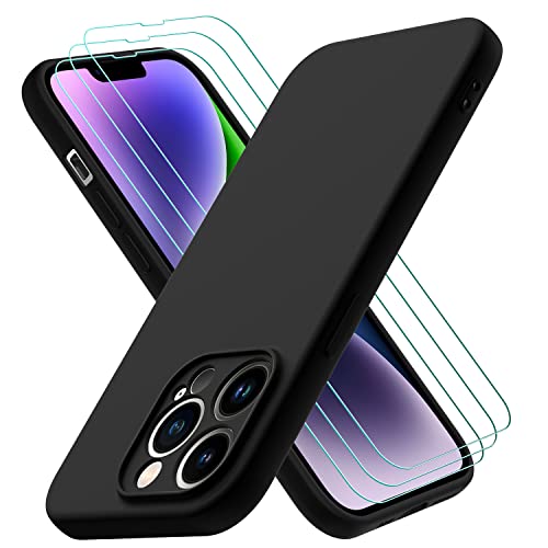 Oureidoo Cover per iPhone 14 Pro con 3 Pezzi Pellicola Vetro Temperato, Custodia in Morbida Silicone Liquido, Sottile e Antiurto con Rivestimento in Microfibra AntiGraffio, Nero