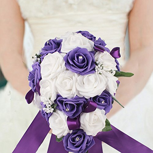 Ourwarm bouquet di fiori bianchi artificiali in seta per sposa, damigella, goccia d'acqua, rosa, perla, cristallo Purple
