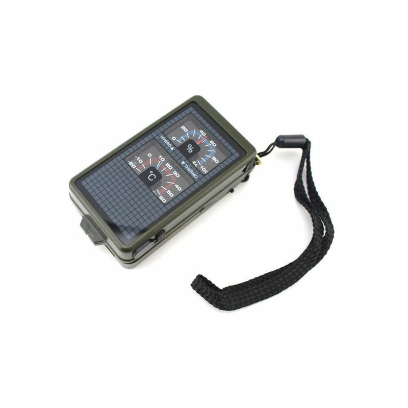 Descrizione Breve descrizione: Bussola: misurazione dell'azimut magnetico (funzioni relative della bussola: acquisire dati a livello orizzontale e verticale). Termometro: misura della temperatura ambiente. Igrometro: misura dell'umidità relativa ambientale. Luce LED: illuminazione. Riflettore: richiesta di aiuto nella campagna., riflettono la luce solare per inviare il segnale luminoso.Livella: determinare lo stato del livello. Descrizione articolo: Bussola: misurazione dell'azimut magnetica (funzioni relative della bussola: acquisire dati in orizzontale e verticale livello) Termometro: misurazione della temperatura ambiente Igrometro: misurazione dell'umidità relativa ambientale Luce LED: illuminazione Riflettore: chiamata per chiedere aiuto in campagna, riflettere la luce del sole per inviare la luce del segnale Livello di spirito: determina lo stato del livello Fischietto: chiama aiuto in campagna, invia il segnale sonoro. (usa il pulsante per spingere il fischietto del terzo