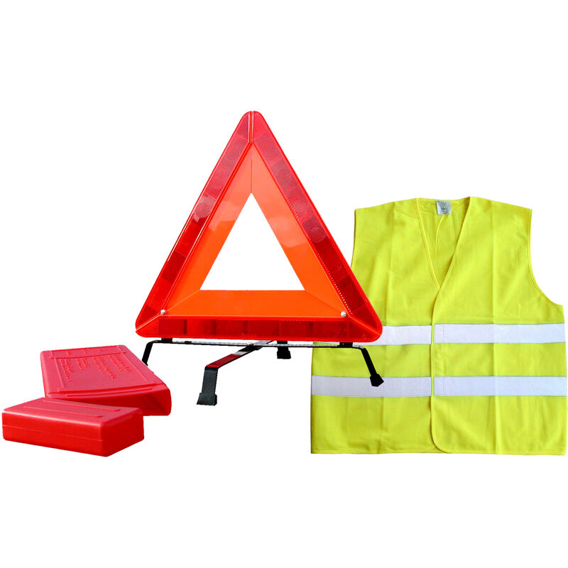 Gilet fluorescente di classe II. Chiusura in velcro. Vai in lavatrice. Piedini triangolari in metallo da 440 mm con gommini. Conforme alle norme europee CE EN471.