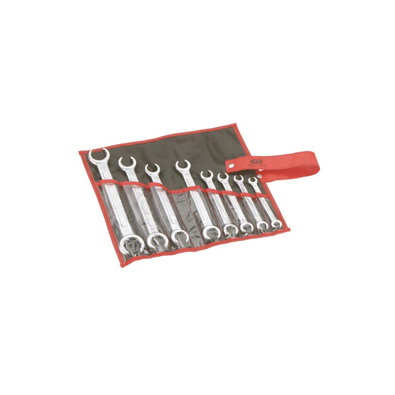 Dettagli: Poligonale a 12 lati. Forgiata in acciaio al cromo vanadio. Chiave lunga per un serraggio potente dei dadi dei raccordi per tubi. Finitura: cromata satinata. Peso: 1800 g Caratteristiche: Contenitore: Kit Numero di pezzi: 8