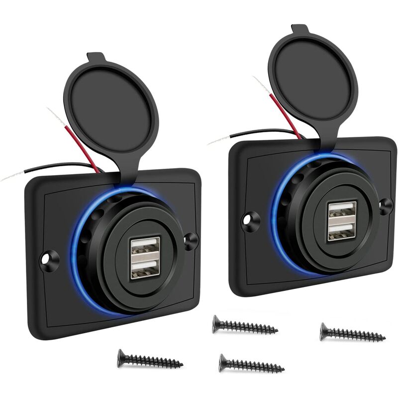 Ampia applicazione - La presa USB da 12 V con due porte di ricarica rapida, che è più veloce dei caricabatterie convenzionali. Inoltre può essere utilizzata per tutti i dispositivi USB più diffusi, come auto, moto, autobus, camper, barche, ecc. 【Design antipolvere】La porta USB a montaggio superficiale è di un alloggiamento in nylon che ha un'efficace resistenza ai graffi. Su ogni porta è presente una copertura elastica antipolvere che può proteggere efficacemente il caricabatterie da improvvisi spruzzi d'acqua e antipolvere . 【Installazione per montaggio superficiale】La doppia porta del caricatore USB può essere installata su una superficie piana, senza bisogno di tagliare un grande foro, solo un piccolo foro per inserire il cavo e facile da installare entro 20 minuti. 【Luce LED blu tenue】Le luci LED blu rendono il montaggio su pannello della porta USB per auto facile da trovare in un ambiente buio e consentono alle persone di verificare se la connessione ha esito positivo. < p> 【Il