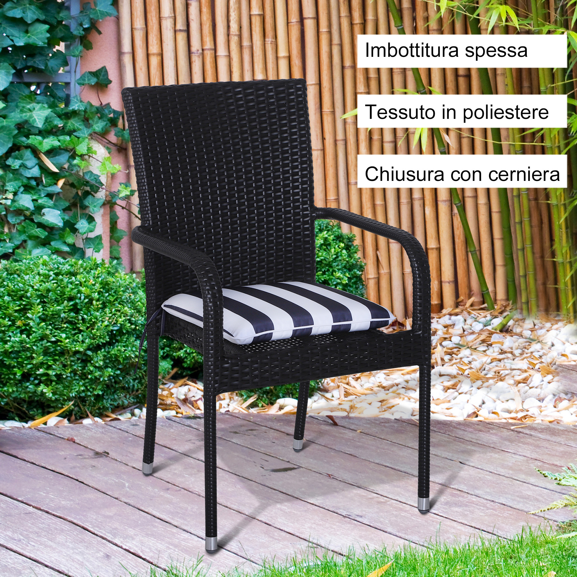 Questi cuscini Outsunny si adattano perfettamente alle vostre sedie, sia in casa che in giardino. Tessuto 100% poliestere resistente e comodo. Le corde da legare assicurano che rimangano in posizione. Fodera rimovibile e lavabile. Ideali per cucina, soggiorno, balcone, ecc.