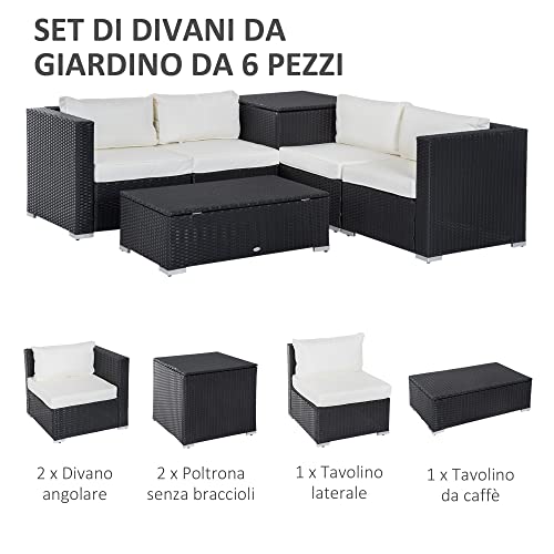 Outsunny Set Mobili da Giardino 6 Pezzi Componibile in Rattan PE, Salotto da Esterno con 4 Poltrone Imbottite e 2 Tavolini Contenitore, Nero e Crema
