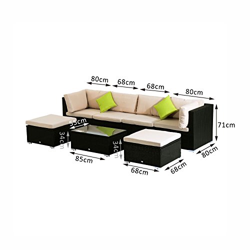 ✅Inclusi 6 cuscini per seduta, 6 cuscini per schienale e 2 cuscini decorativi verdi Il tavolino è rivestito in vetro temperato di 5mm di spessore - Materiale: PE rattan ( Nero ), tubi zincati, poliestere