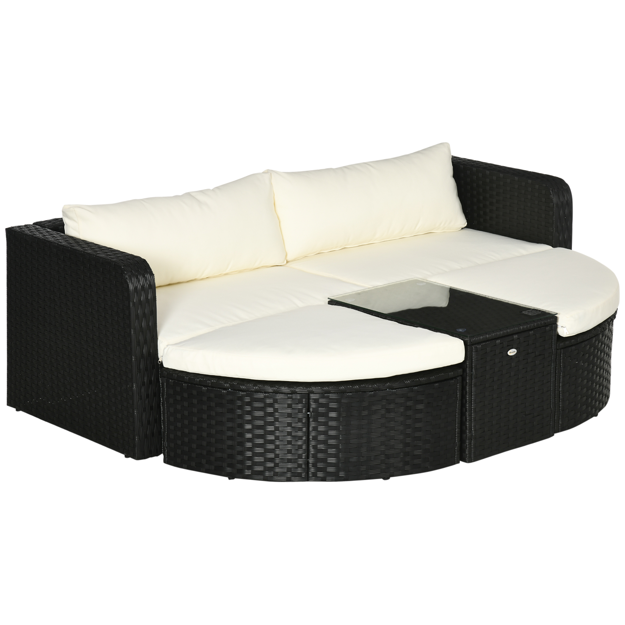 Rendi elegante e confortevole il tuo giardino con questo salotto da esterno Outsunny. Composto da 2 poltrone, 2 poggiapiedi e tavolino con piano in vetro, ha una solida struttura metallica rivestita con rattan PE, materiali che assicurano resistenza all'uso esterno. I morbidi cuscini rendono la seduta rilassante, creando un'oasi di relax da vivere in compagnia!