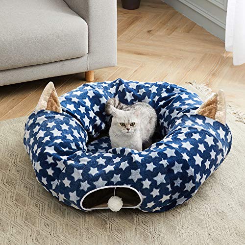OUZHOU - Letto a tunnel per gatti con cuscino, con tubo pieghevole e letto rimovibile, per giocare a tunnel per gatti, con palla divertente per interni e gattini, colore: blu