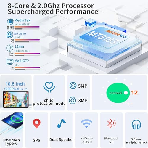 OUZRS Tablet 10.6 Pollici 8GB RAM+64GB ROM (TF 1TB) Android 12 Tablet in offerta MT8183 Octa-Core 2GHz, 2.4G/5G WiFi, Camera 8MP+5MP/6850mAh/BT5.0/Type-C/GPS/Gyro/Headphone Jack/OTG (Argento)