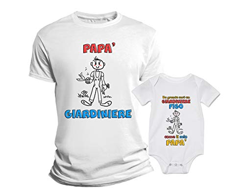 Overthetee Coppia Tshirt Papà e Body Figlio - Papà Giardiniere - Festa del Papà - Da grande sarò un Giardiniere Figo Come il mio Papà - Body Neonato - Idea Regalo Papà