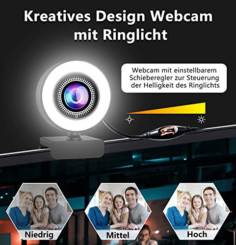 ★ Luce di Riempimento AD Anello Regolabile: Webcam con luce che può regolare la luminosità come desideri e può ottenere un effetto di luce di riempimento uniforme in condizioni di scarsa illuminazione. È possibile spostare il cursore in base alle condizioni di illuminazione per regolare la luminosità della luce di riempimento. Non c'è bisogno di luce di riempimento extra, può solo ottenere un effetto di luce di riempimento più uniforme. È perfetto come regalo di Natale.