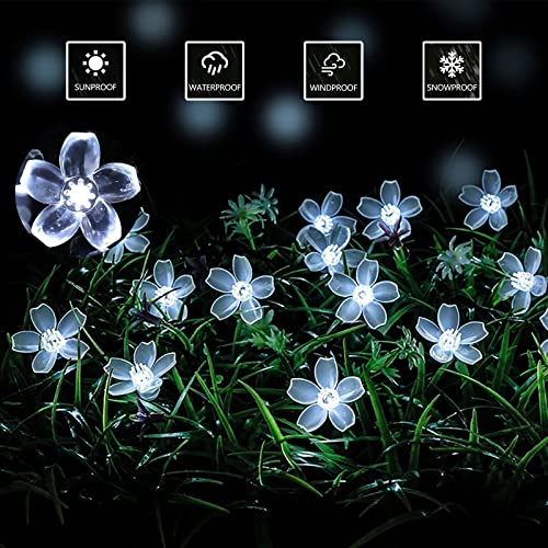Ovker Catena Luminosa Solare Esterno, 7M 50 LED Luci a Stringa Solari Giardino, 8 Modalità Lampada Fiore di Ciliegio Impermeabile, Sakura Fiori di Fata Interno per Festa Natale Decorazione (Bianco)
