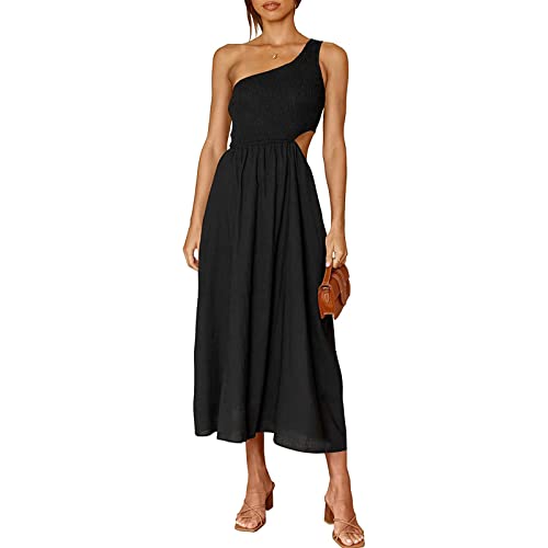 Owegvia Donne Tie Up Tracolla Volant Abito Lungo Senza Maniche Scollo Quadrato Shirred Alto Split Maxi Abito Estate Spiaggia Partito Abito, B nero, XL