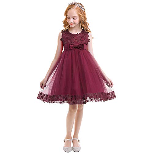 OwlFay Vestito Ragazze Fiore Pizzo Abito Senza Maniche Principessa Tulle Abiti Compleanno Festa Nozze Prima Comunione Battesimo Danza Cerimonia Sera Vestito per Bambine Rosso Porpora 2-3 Anni