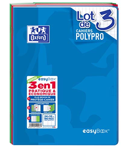 Oxford EasyBook - Set di 3 quaderni rilegati con graffette, formato grande, 24 x 32 cm, 96 pagine, a quadretti grandi, 90 g, colori assortiti