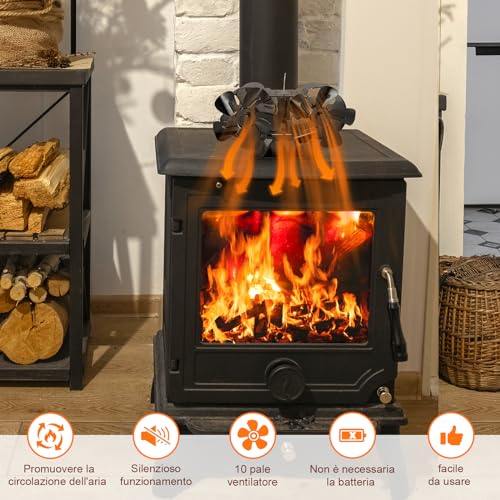 【Risparmio energetico】Questa Ventola per stufa a legna non richiede batterie o elettricità ed è progettata per far circolare l'aria calda prodotta da legna/carbone o pellet. La ventola termica a 10 pale fa circolare in modo efficiente il calore generato dalla camera di combustione migliorandone la stabilità, che ha dimostrato di risparmiare il 38% sui costi del carburante e ridurre il consumo di legna nella stufa