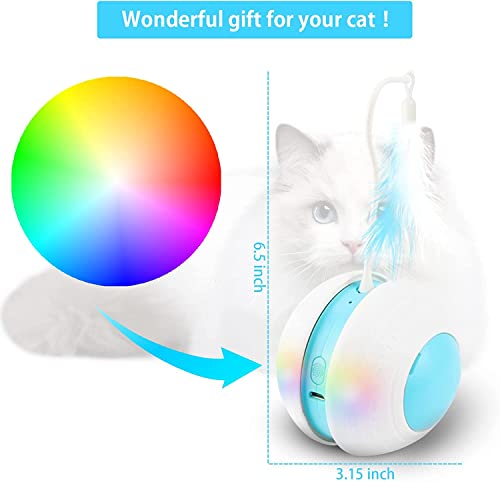 Giocattolo per gatti a rotolamento irregolare: il giocattolo automatico per gatti può essere acceso o spento dopo due secondi di pressione per evitare di toccare accidentalmente l'interruttore durante il funzionamento. Dopo l'accensione, rotola in modo irregolare e quando si rotola accompagnato da un effetto luminoso a LED colorato che lampeggia lentamente che aumenta l'interesse del gatto nel gioco