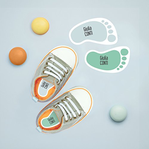 PER CONTRASSEGNARE I CAPI D'ABBIGLIAMENTO: etichette per scarpe per non perdere le scarpette, le scarpe da ginnastica, ecc... etichette da stirare, da attaccare con il ferro da stiro (senza vapore), per contrassegnare body, magliette, gonne, ecc... ed etichette Ludisticks, da attaccare sull'etichetta del marchio del peluche, del cappello, dei cappotti, ecc...