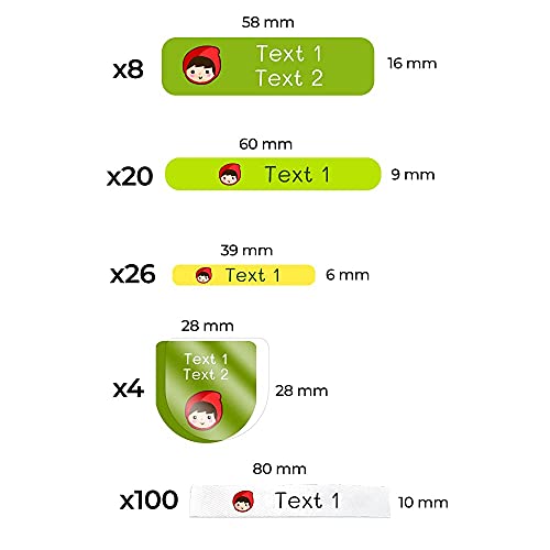 Pacchetto di 155 etichette personalizzate per contrassegnare abiti e oggetti. 100 Etichette di tessuto termoadesivo + 55 Etichette adesive in vinile. Mod: Storie
