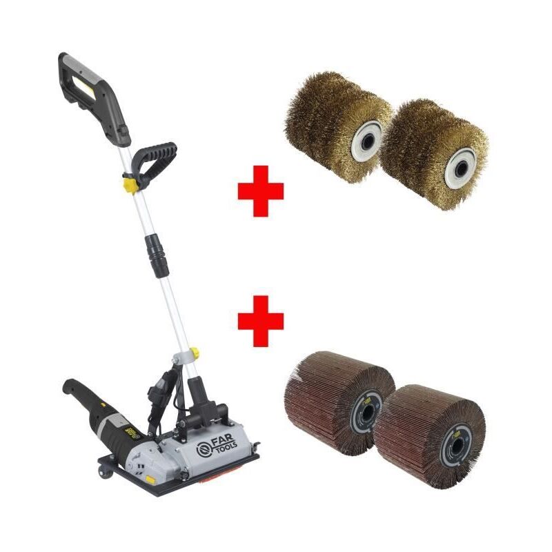 PACK composto dalle referenze FARTOOLS 115019 + 2x110885 + 2x110868: GRANDE RISTRUTTURATORE A PIEDE PER SUPERFICIE TERRENO (dotato di serie di 2 spazzole nylon abrasive) + 2 SPAZZOLE IN FILO DI OTTONE + 2 SPAZZOLE ABRASIVE LAMELLARI. Il rinnovatore di grandi superfici è la macchina ideale per sverniciare, sgrassare, strofinare, levigare grandi superfici in piedi. Rinnova il tuo terrazzo (legno o lastra) o il tuo parquet senza usare acqua o prodotti chimici. A seconda della natura del rivestimento del tuo pavimento, e grazie alle varie spazzole disponibili e al variatore di velocità, puoi facilmente dare un lifting ai tuoi materiali senza difficoltà!