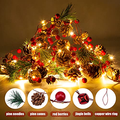 【Ornamenti natalizi classici naturali realistici】: la ghirlanda artificiale pre-illuminata si estende lungo 2 m, decorata con 20 luci calde a LED, pigne dall'aspetto realistico, aghi di pino, campane jingle e piccole bacche rosse. Facile creare un'atmosfera festosa, calda e romantica!