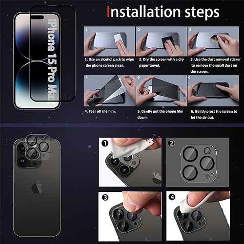 【Modelli compatibili】: Appositamente progettato per iPhone 15 Pro Max 6,7". 2 Pezzi Privacy Pellicola Protettiva Vetro Temperato + 2 Pezzi Pacchetto di installazione. Mantieni il tuo telefono completamente protetto.