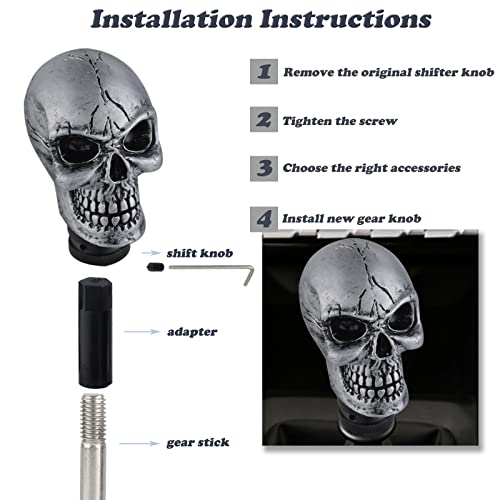 Dimensioni del prodotto: questa maniglia della leva del cambio del teschio misura 44,5 x 85,6 mm e la confezione con 3 adattatori universali misura 0,8 cm, 0,3 pollici, 1,2 cm (8 mm, 10 mm, 12 mm).