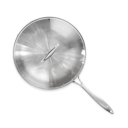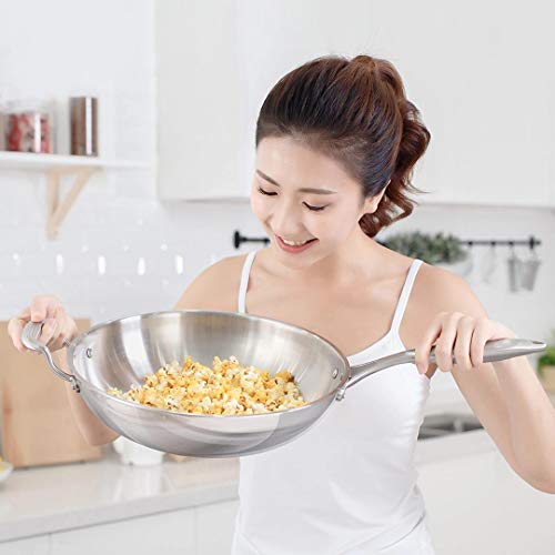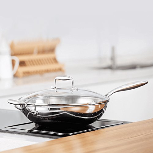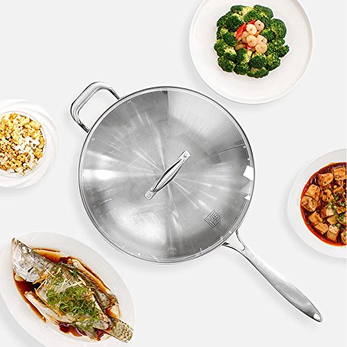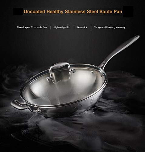 Padella in acciaio inox con manico e coperchio, multiuso, wok in acciaio inox Coperchio in vetro (Argento, 32CM)...